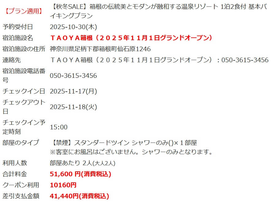 TAOYA箱根は人気が高く、同じ宿泊内容でも予約サイトによって料金や特典が変わることがよくあります。